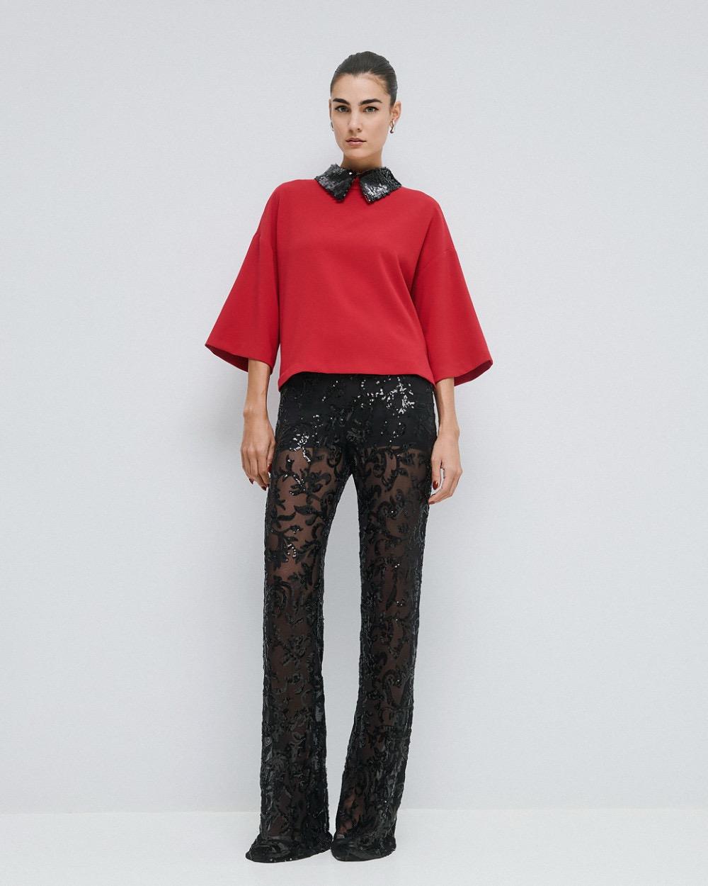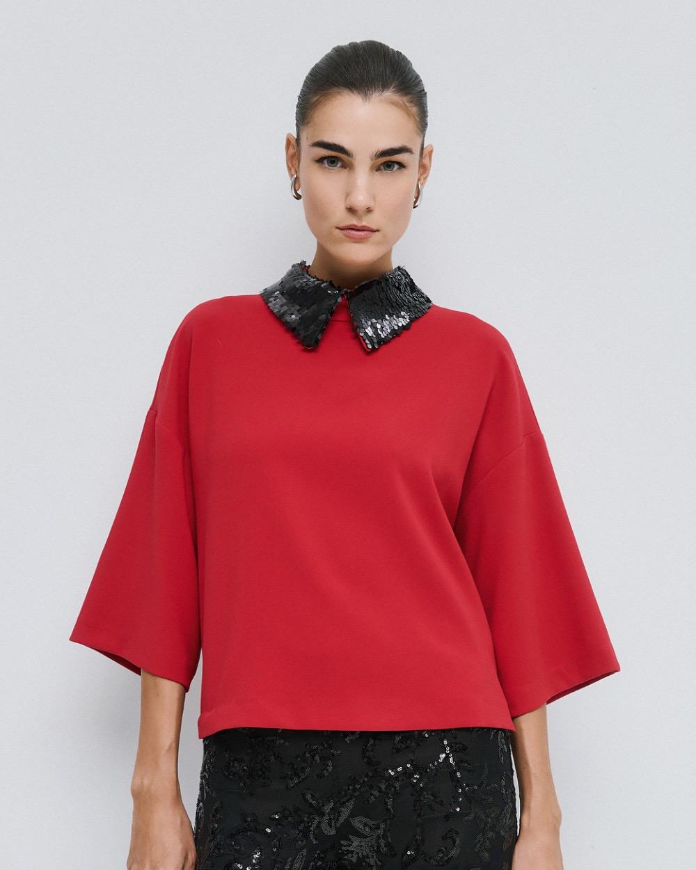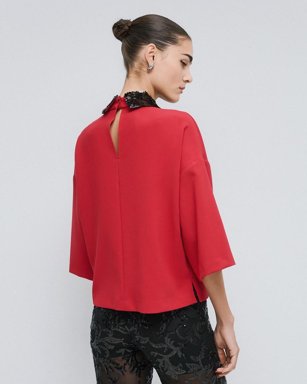 Blouse with 3/4 wide sleeves and a detachable sequin collar. Choose it for elegant looks with a touch of sparkle.