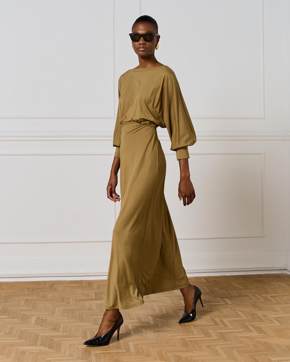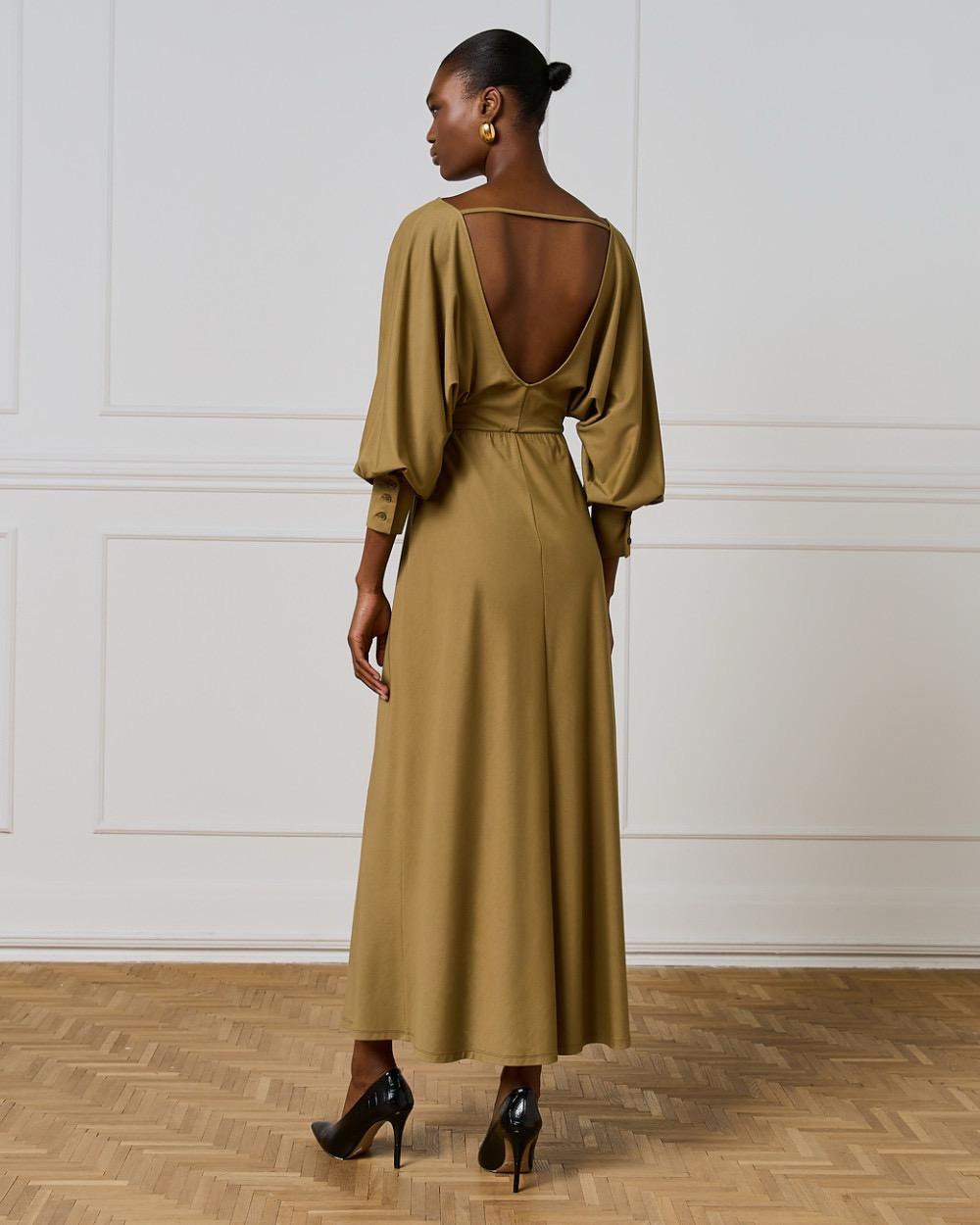 Maxi dress with an open back and boat neckline. Features long batwing sleeves and an elastic waistband. It is a perfect choice for elegant looks.