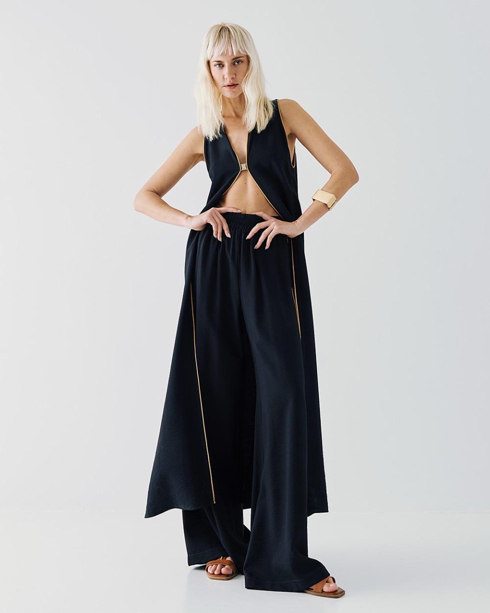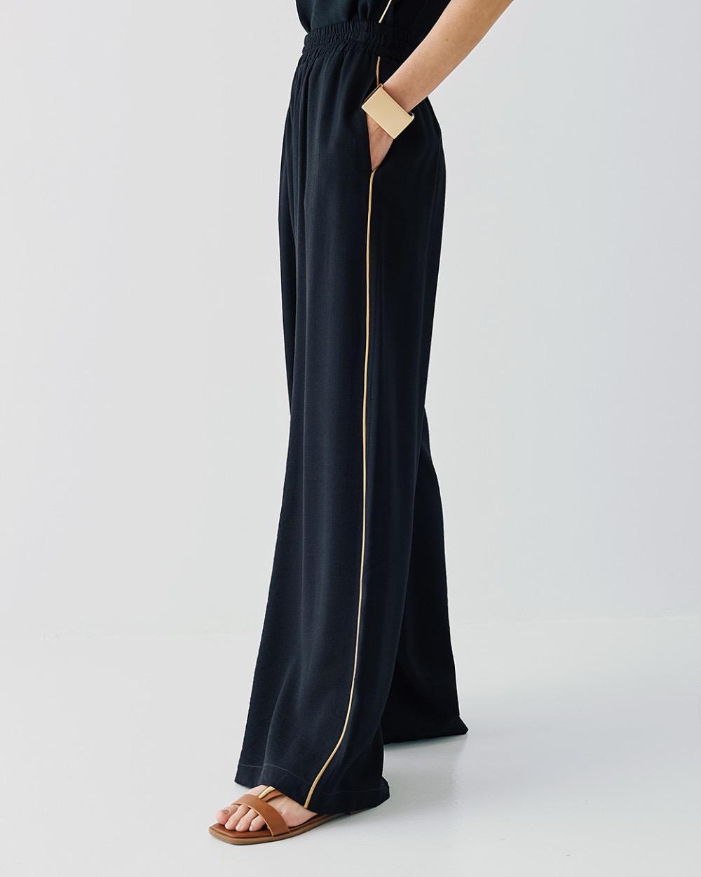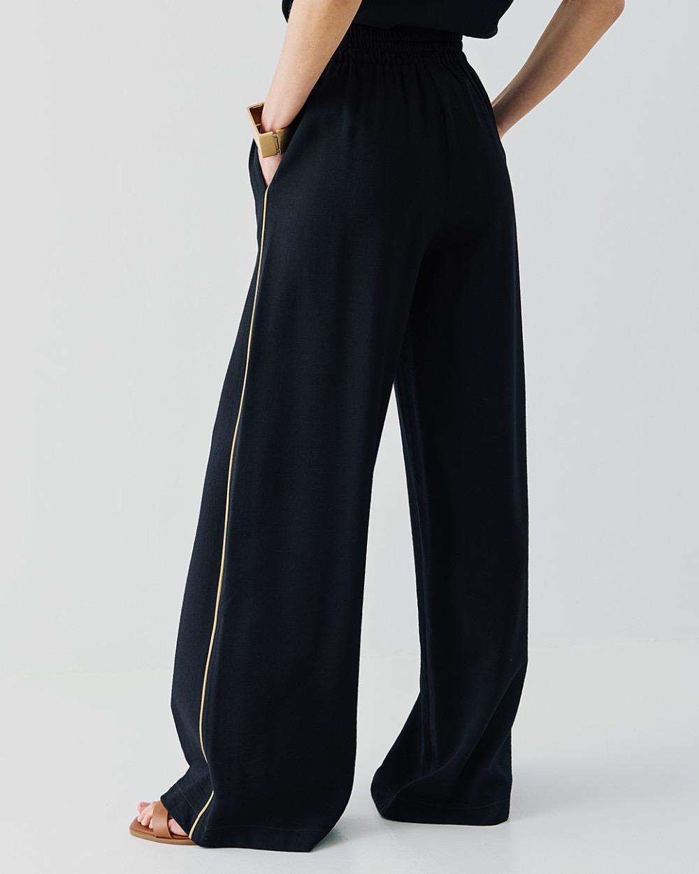 High-waisted, straight-leg pants with two-tone side details. They feature side pockets and an elastic waistband. Pair them with the matching top from our collection for stylish casual looks.