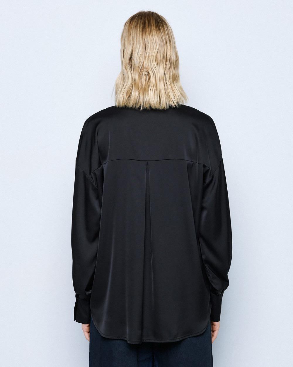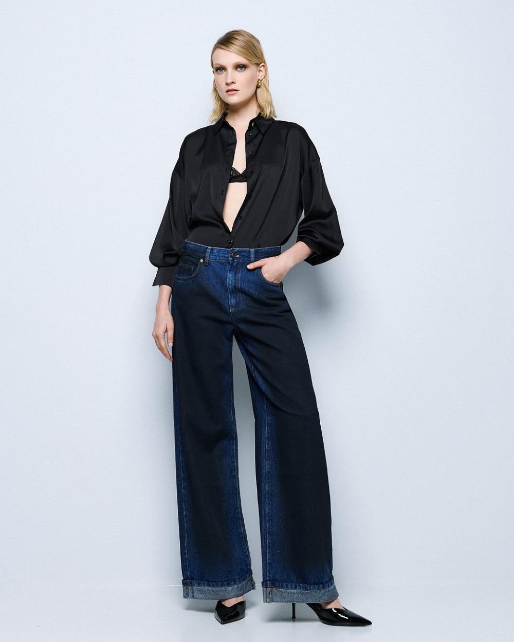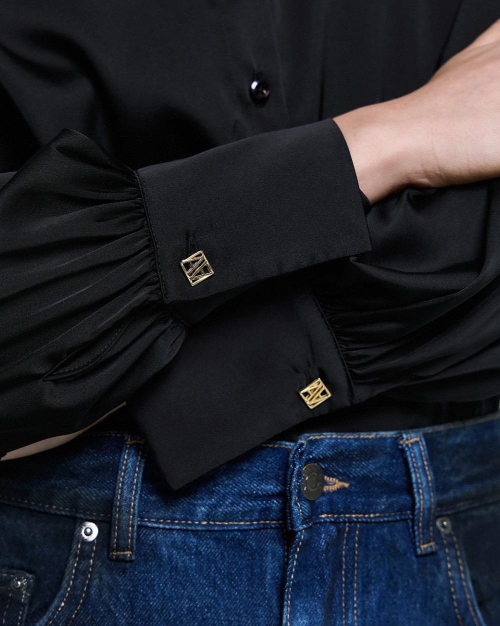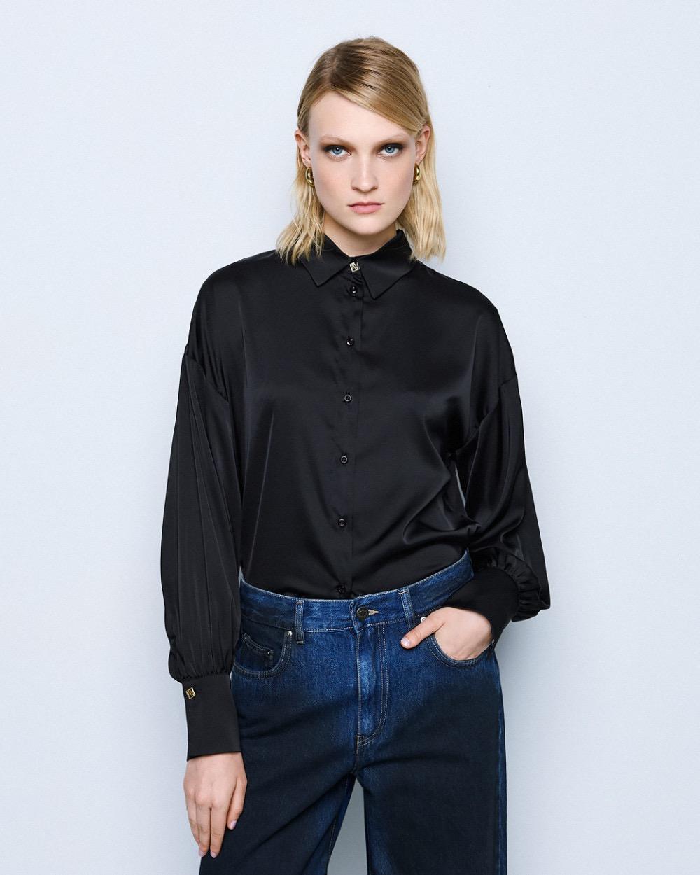 Satin shirt with long puff sleeves. It features a collar and monogram buttons on the cuffs. It is an essential addition to every elegant woman’s wardrobe.