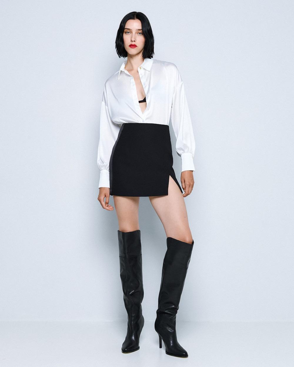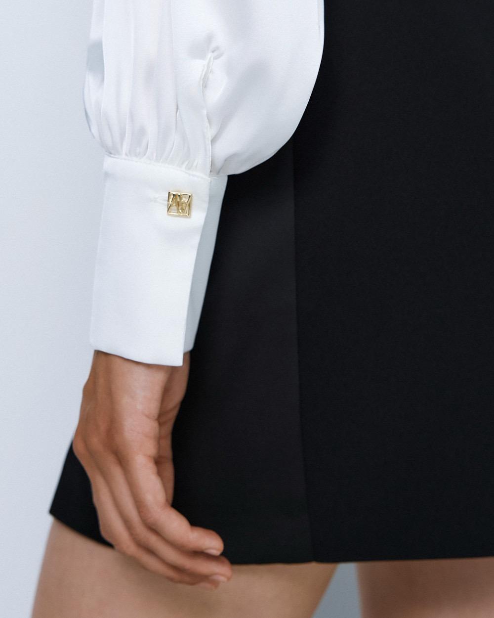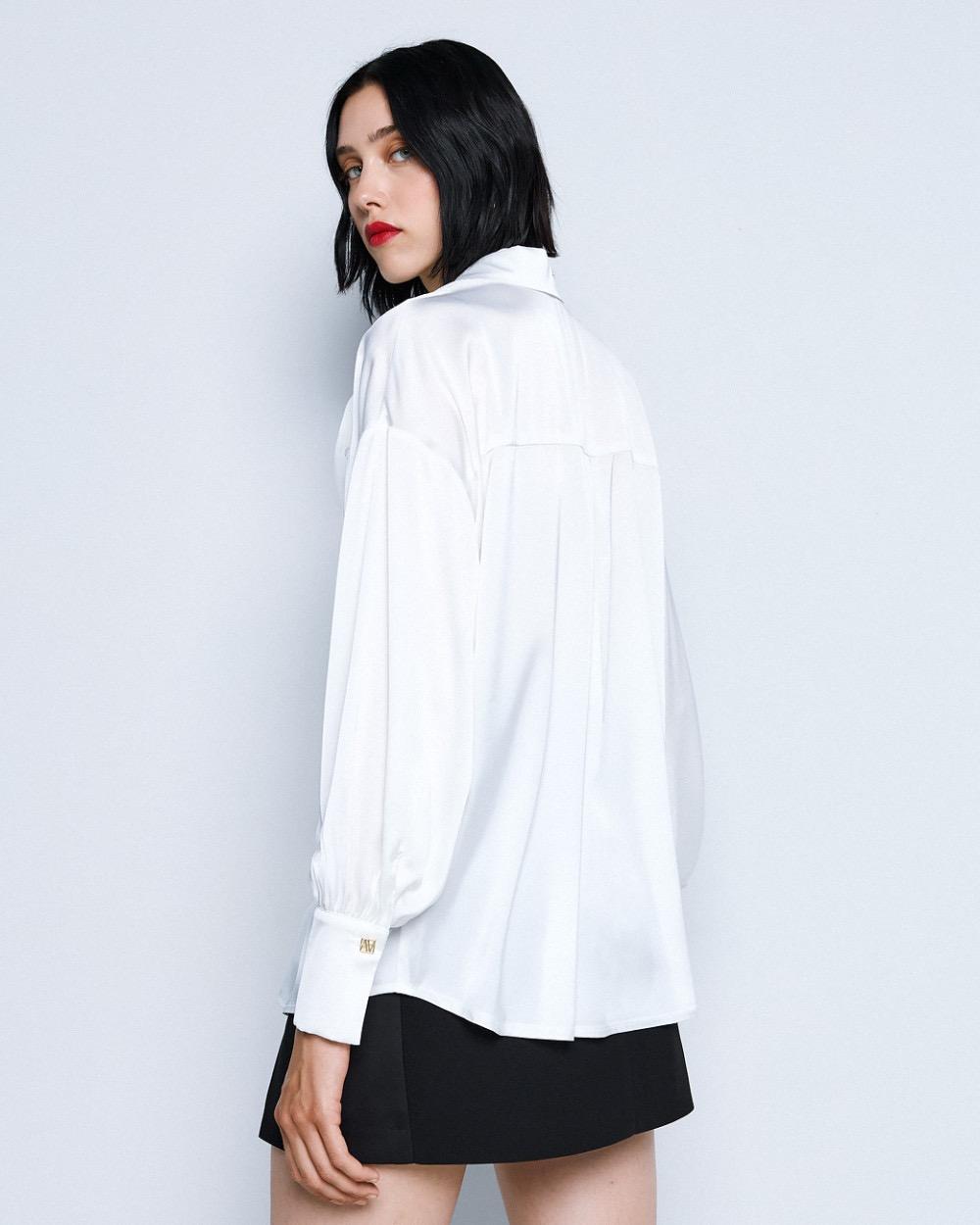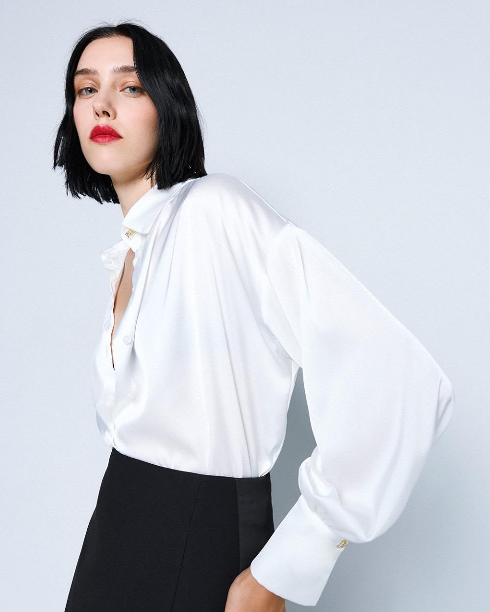 Satin shirt with long puff sleeves. It features a collar and monogram buttons on the cuffs. It is an essential addition to every elegant woman’s wardrobe.