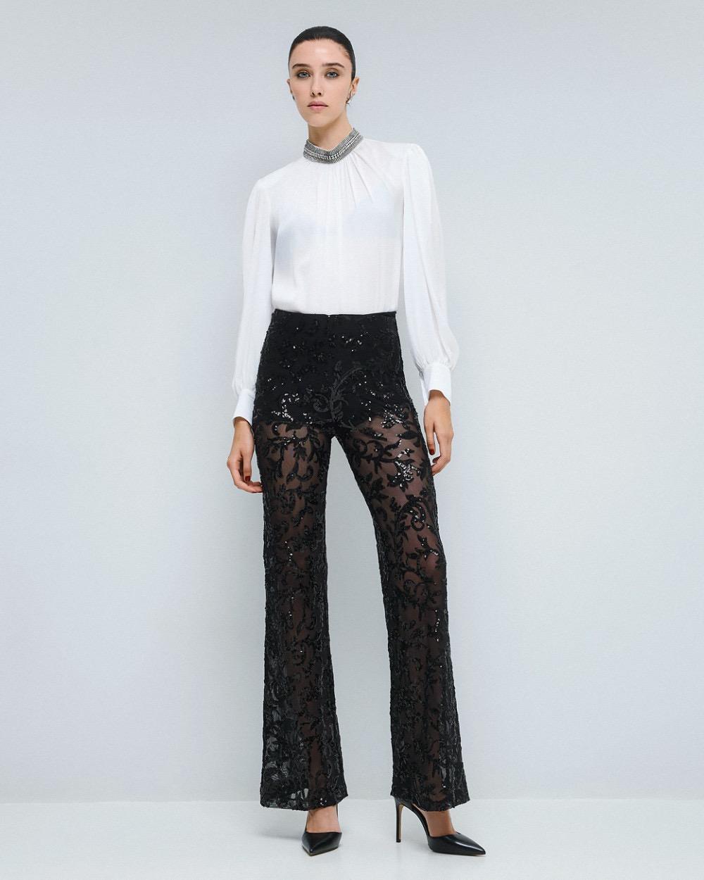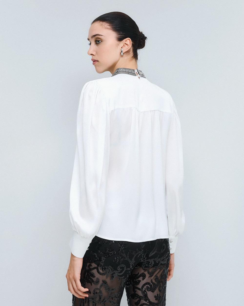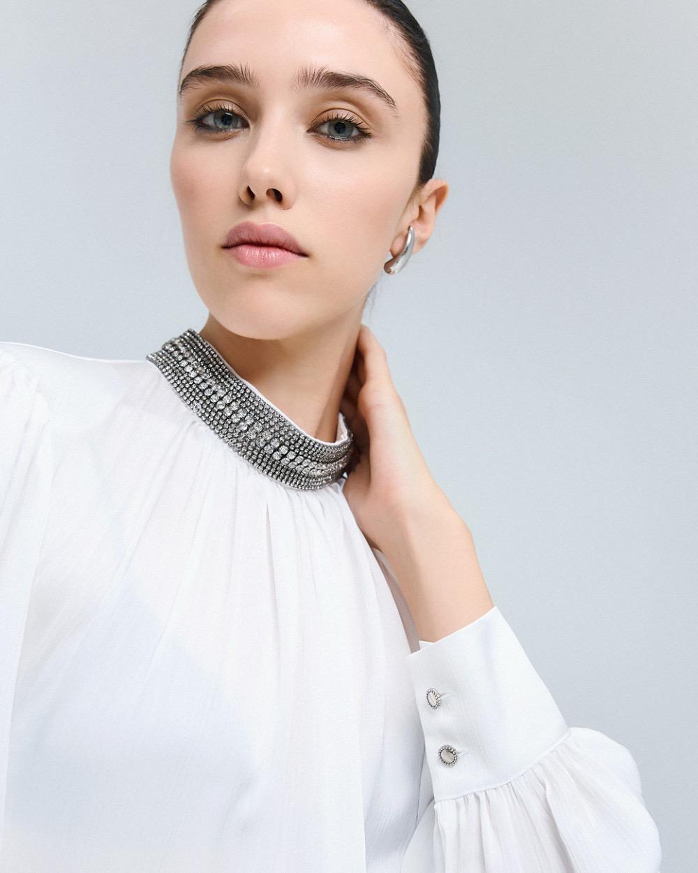 Blouse with a shimmery embossed finish and gathered details. It features padded shoulders and a high neckline with rhinestone trim. Perfect for elegant looks.