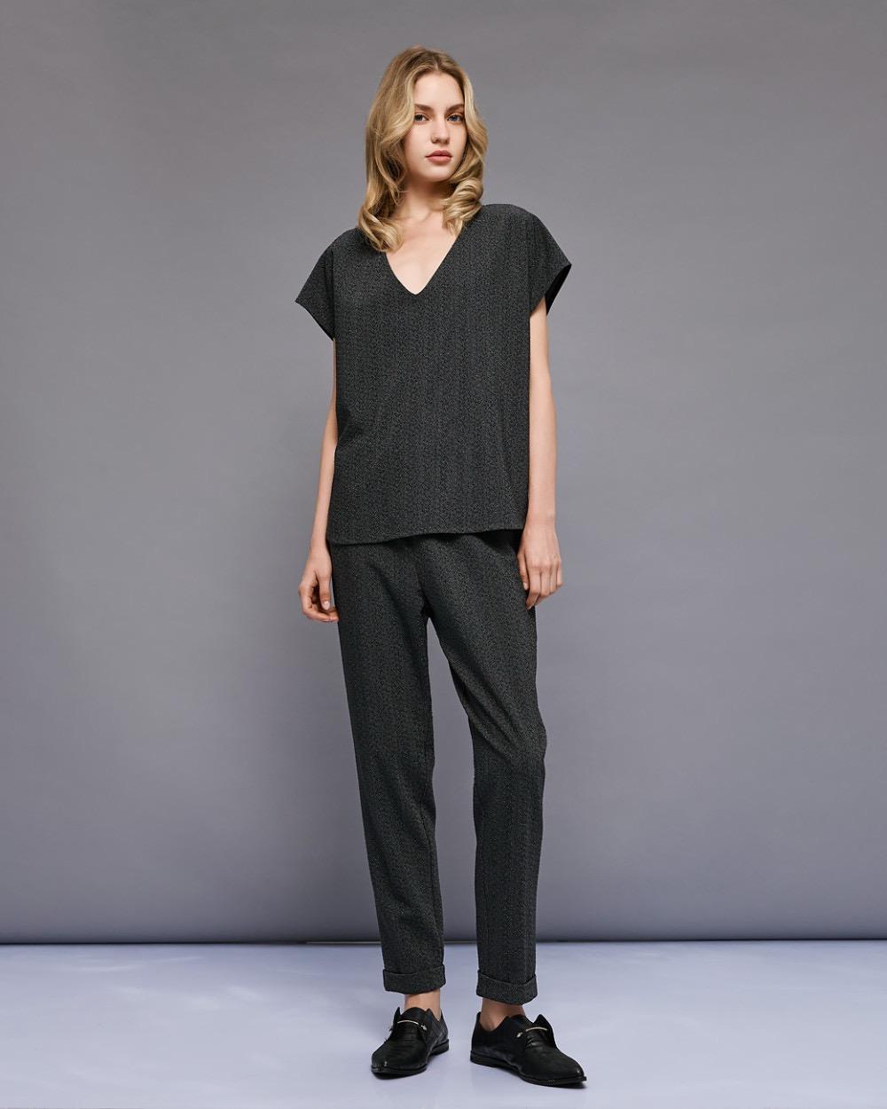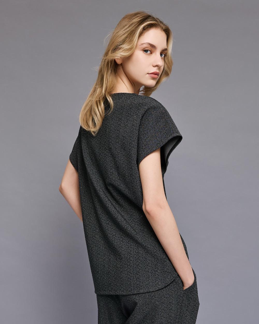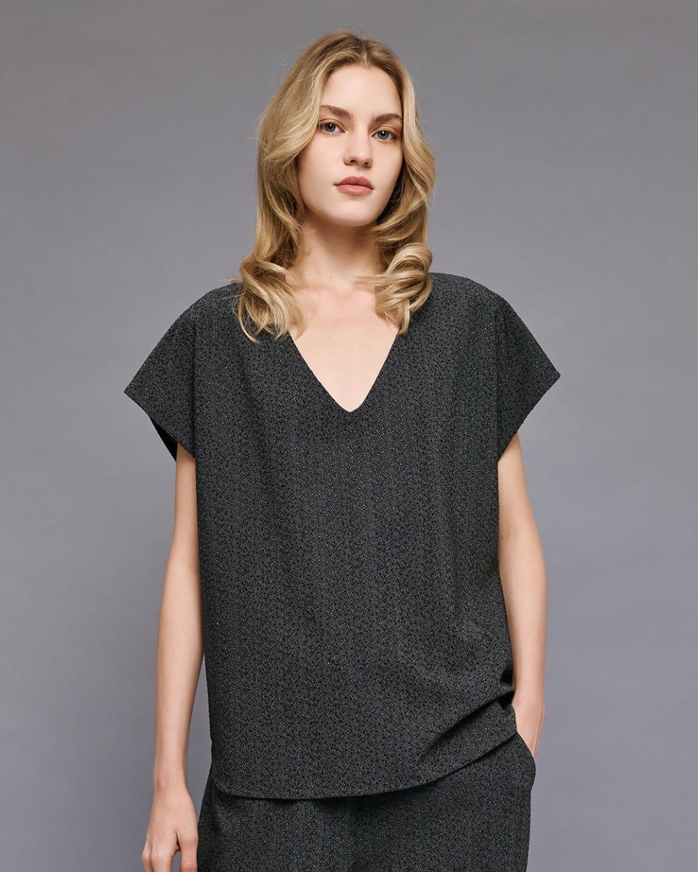 Short-sleeved blouse with rhinestone details and a V-neckline. Pair it with the matching pants from our collection for an elegant and radiant look.