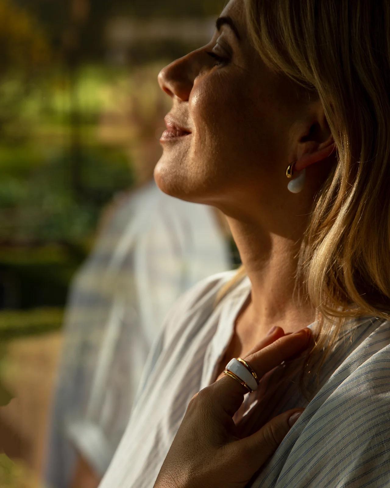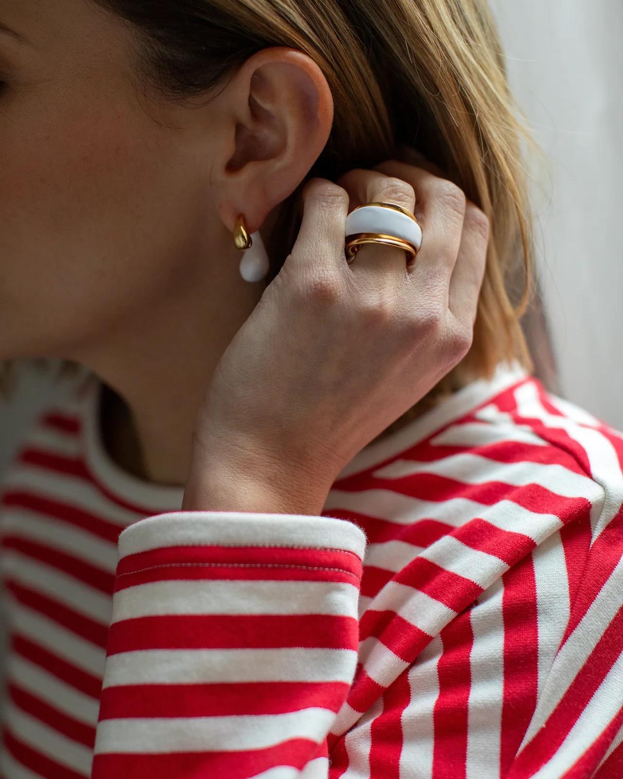 This stunning enamel ring has been made with an adjustable design to ensure a secure fit on every finger. Finished with gold plating and a unique white enamel detailing.