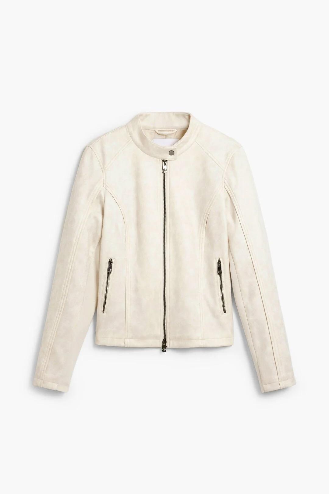The soft white tone and slightly worn-effect finish give the jacket a relaxed yet polished aesthetic that pairs effortlessly with denim, dresses or tailored trousers.