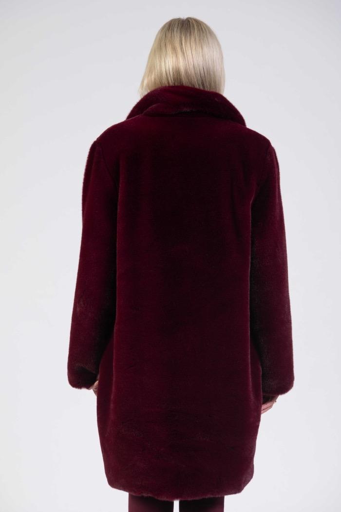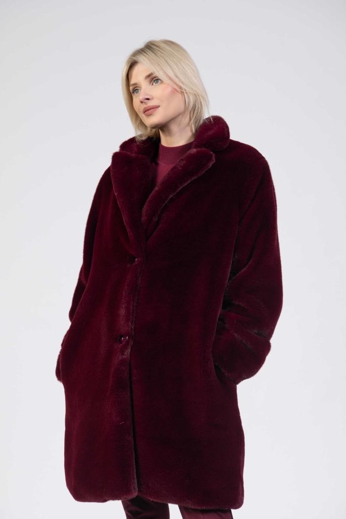 Faux fur coat, longer relaxed fit, two buttons, rich cherry colour.