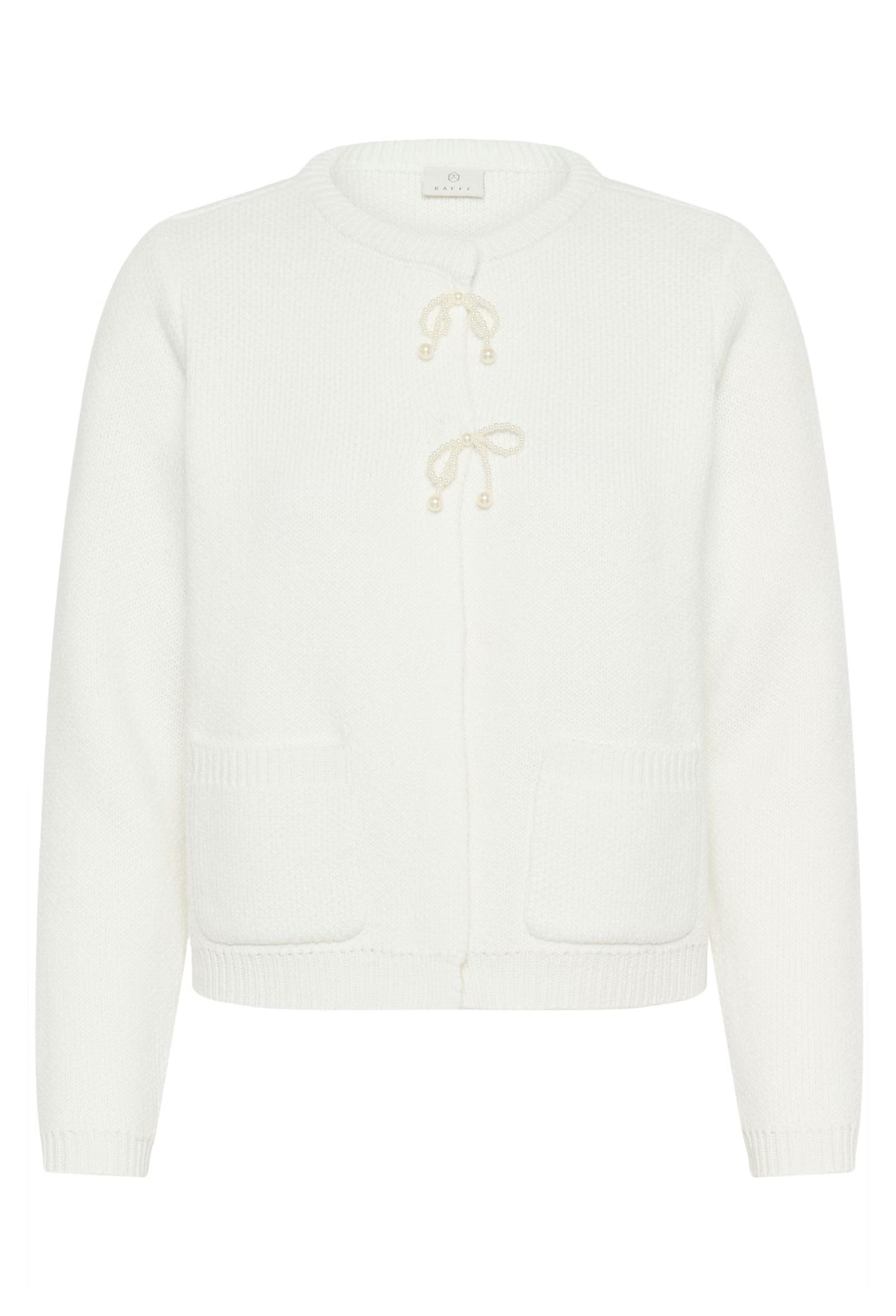This cardigan has a straight fit and a soft textured appearance. It features a round neckline, long sleeves, two front patch pockets, and two bow ties with decorative beads as closures on the front. The hem and cuffs are ribbed.