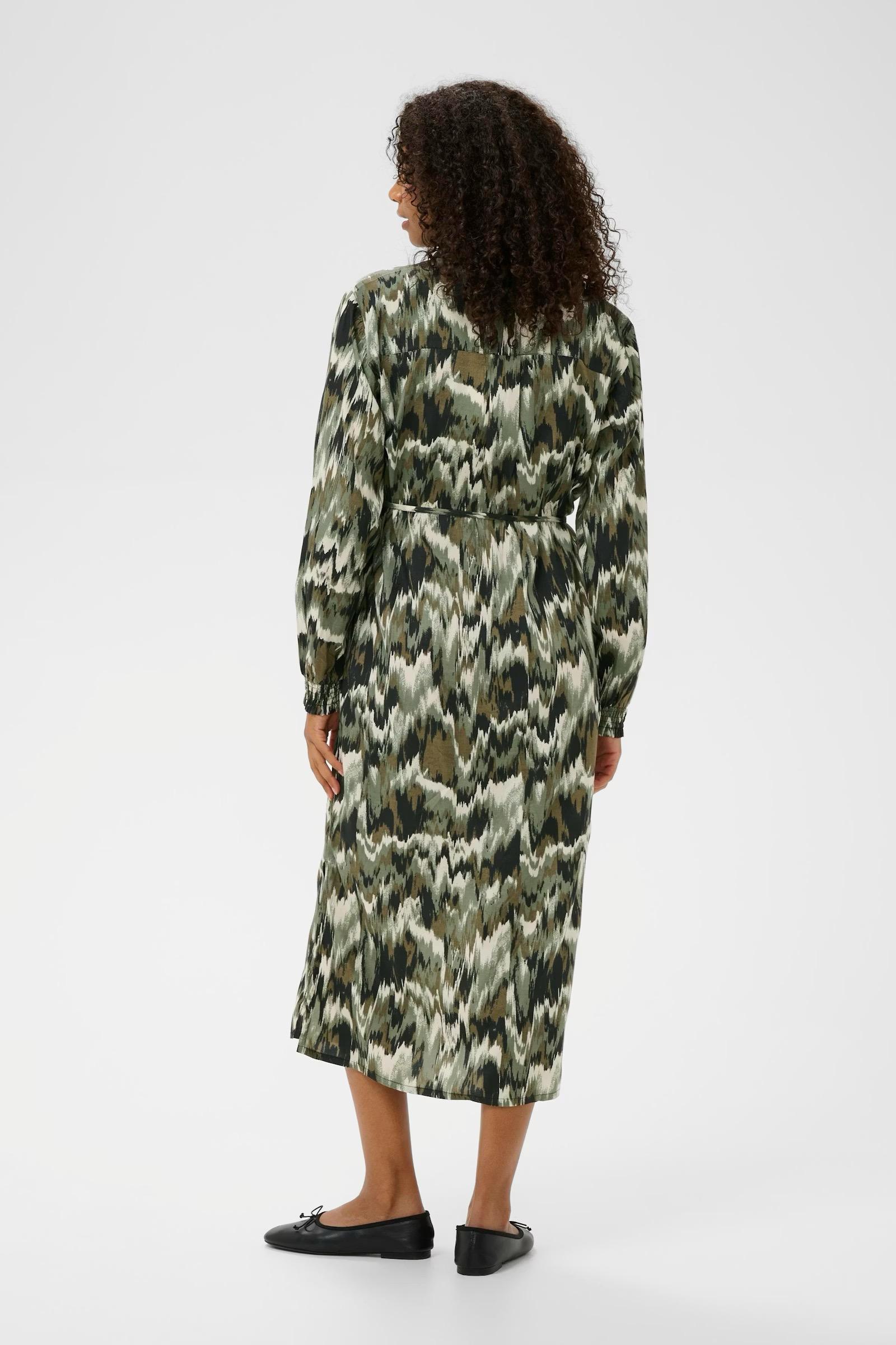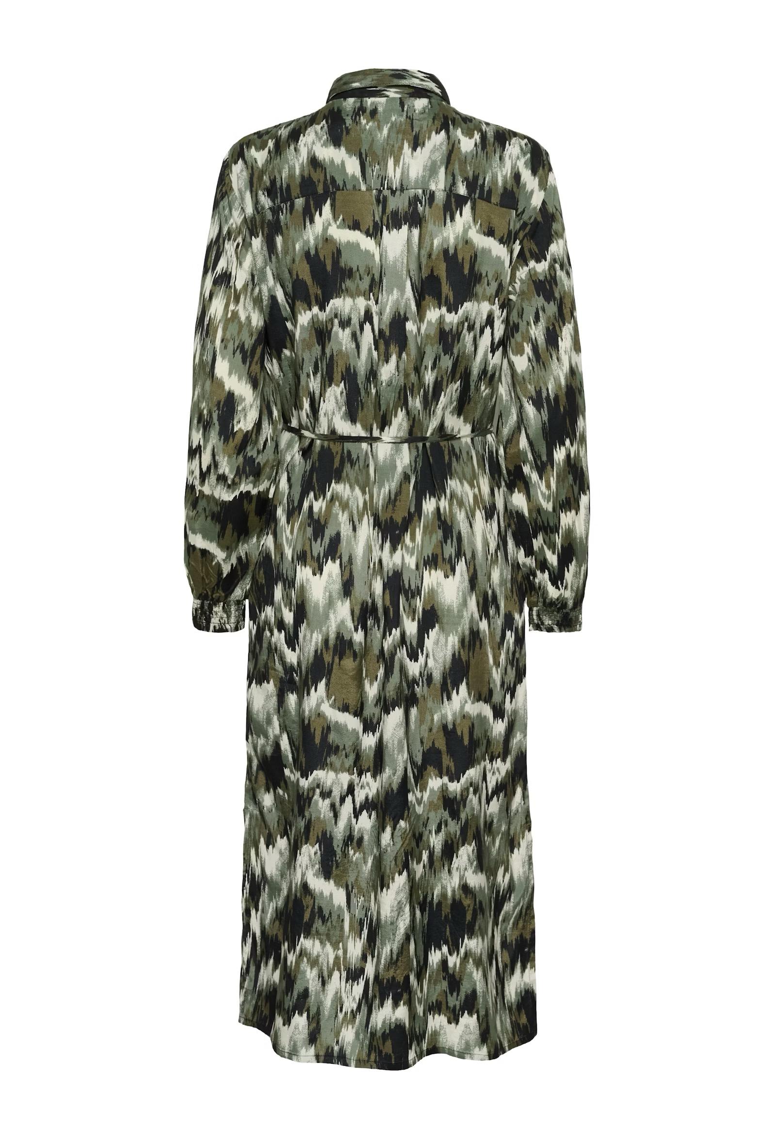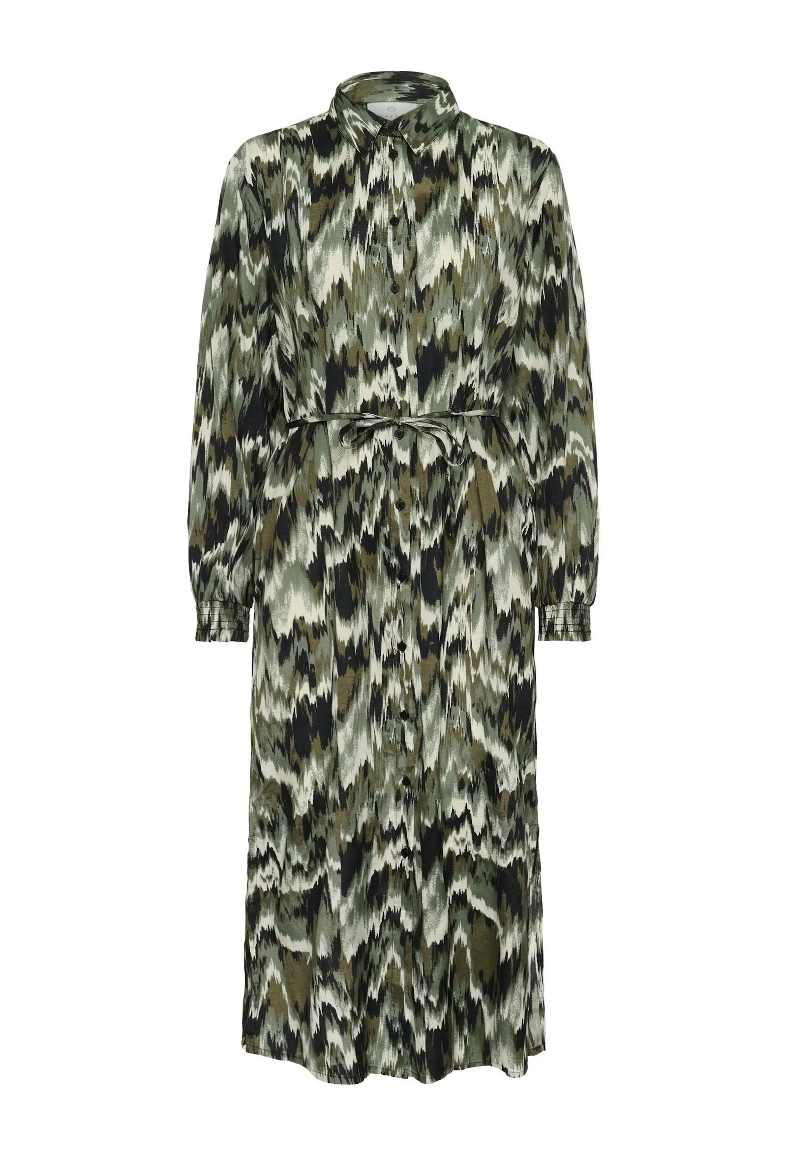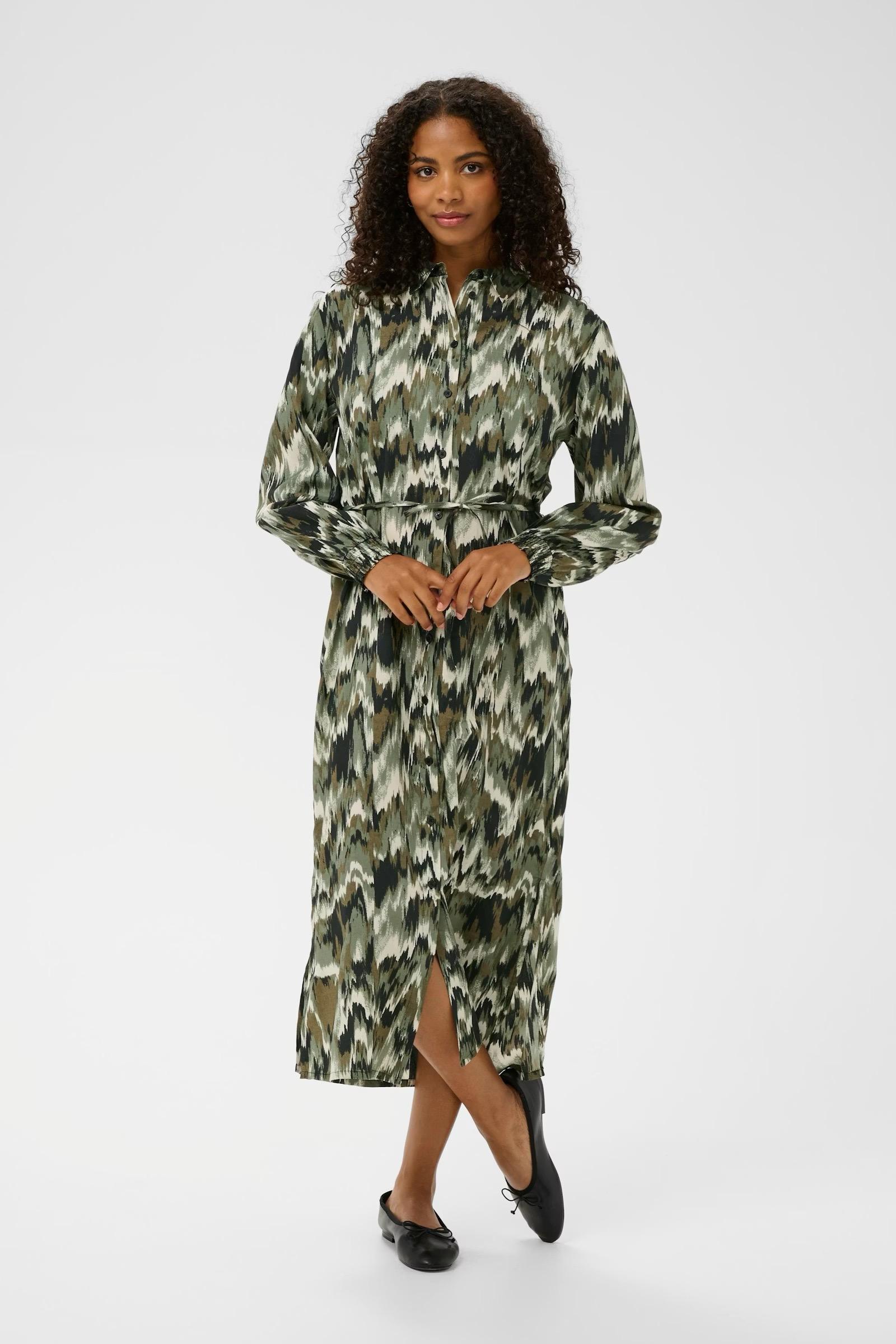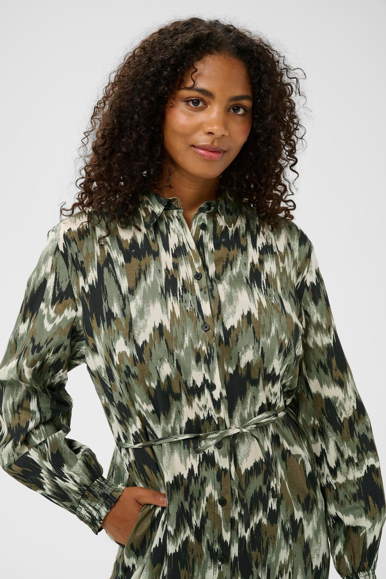 Shirt dress features an all-over abstract print, a button-down front, classic collar, and belted waist. Long sleeves with gathered cuffs and a midi length create a modern silhouette.