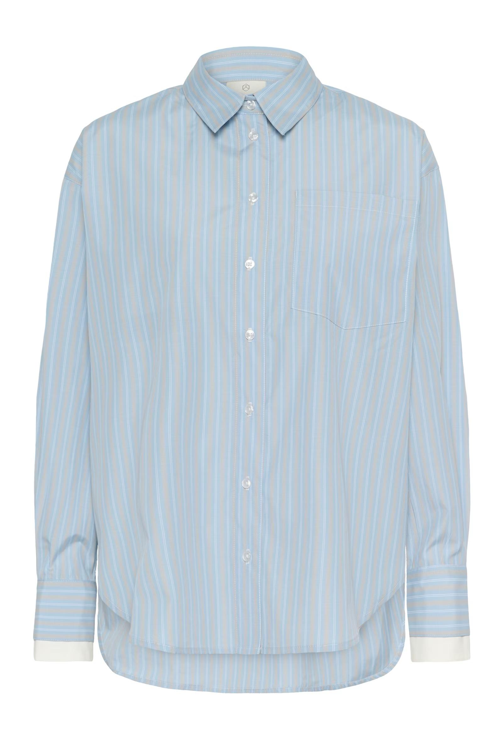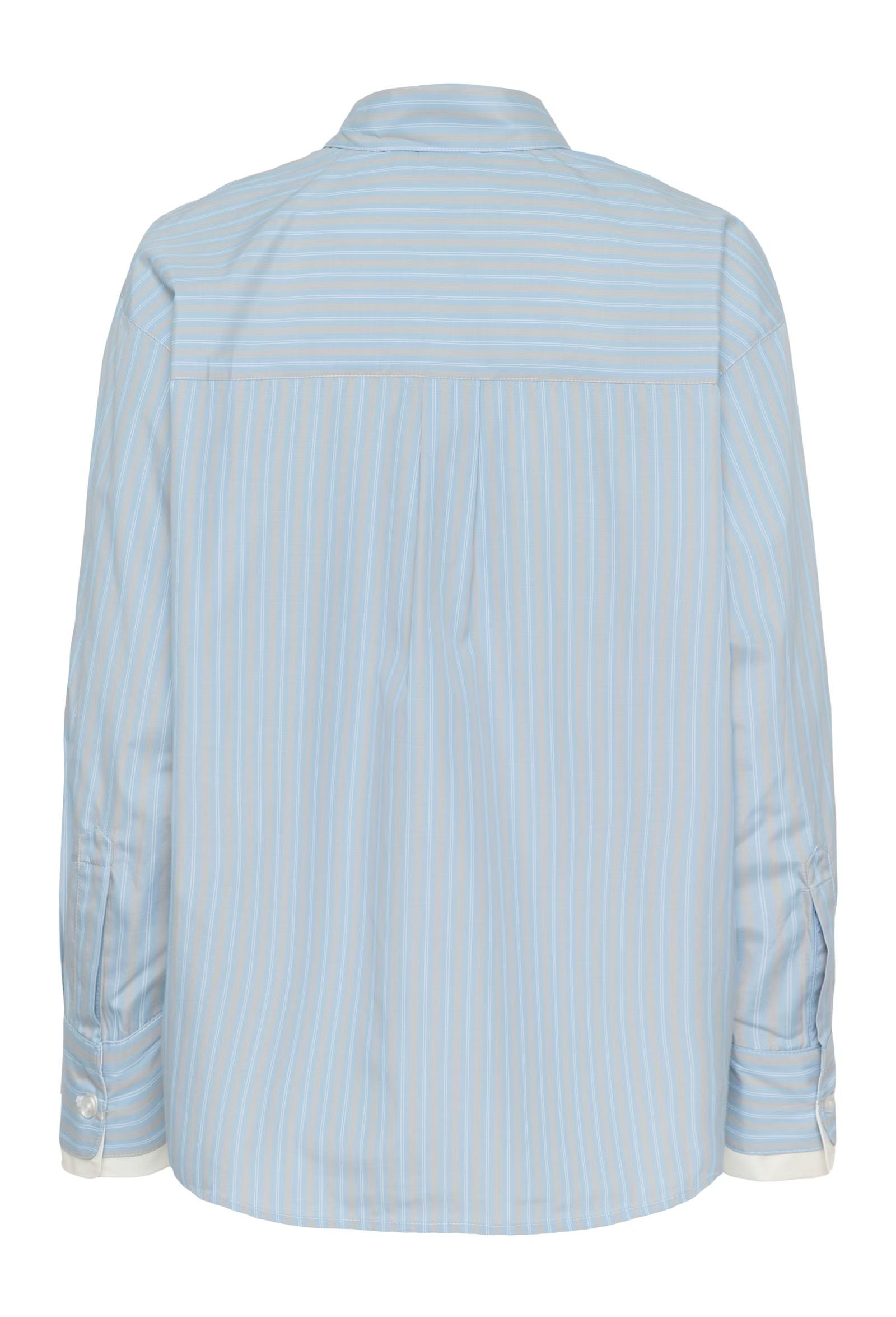 This striped shirt features a classic button-up front, pointed collar, and single chest pocket. The relaxed silhouette and long sleeves with contrasting cuffs create a contemporary look. Slightly rounded hem finishes the design.