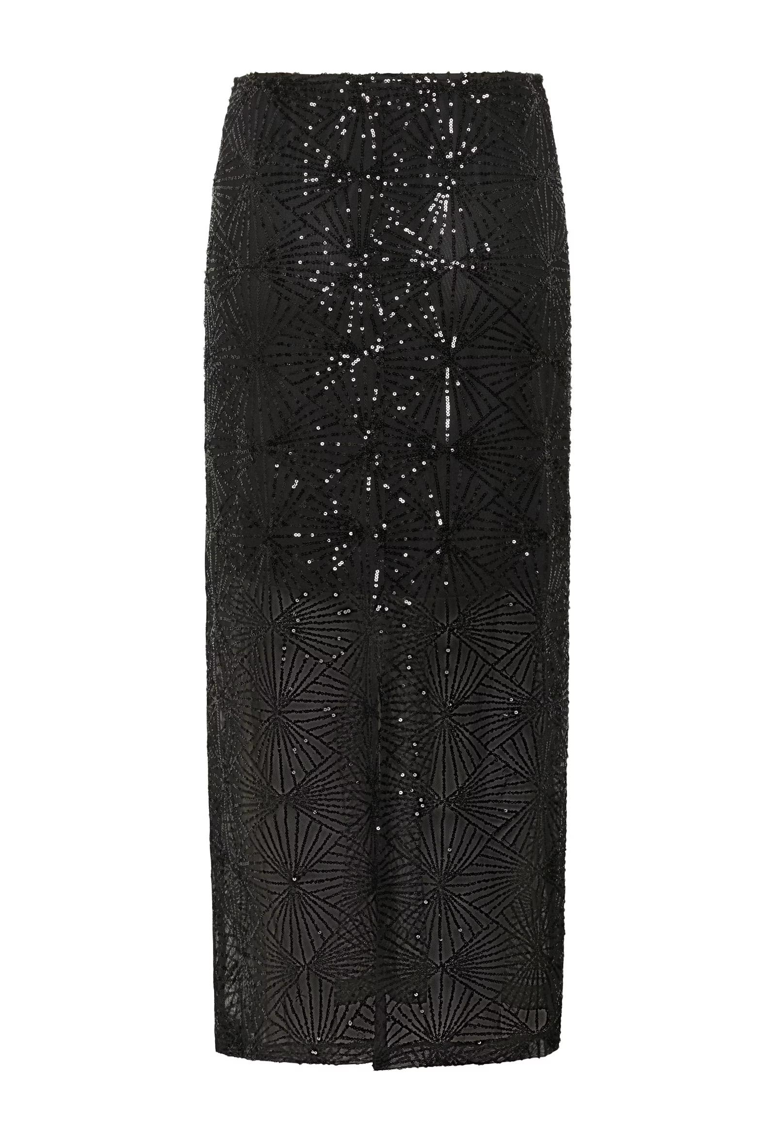 This long skirt features a straight silhouette with geometric sequin detailing and a sheer mesh overlay. Fitted waist and ankle-length cut create a sophisticated, modern look that delivers bold texture and standout shine.