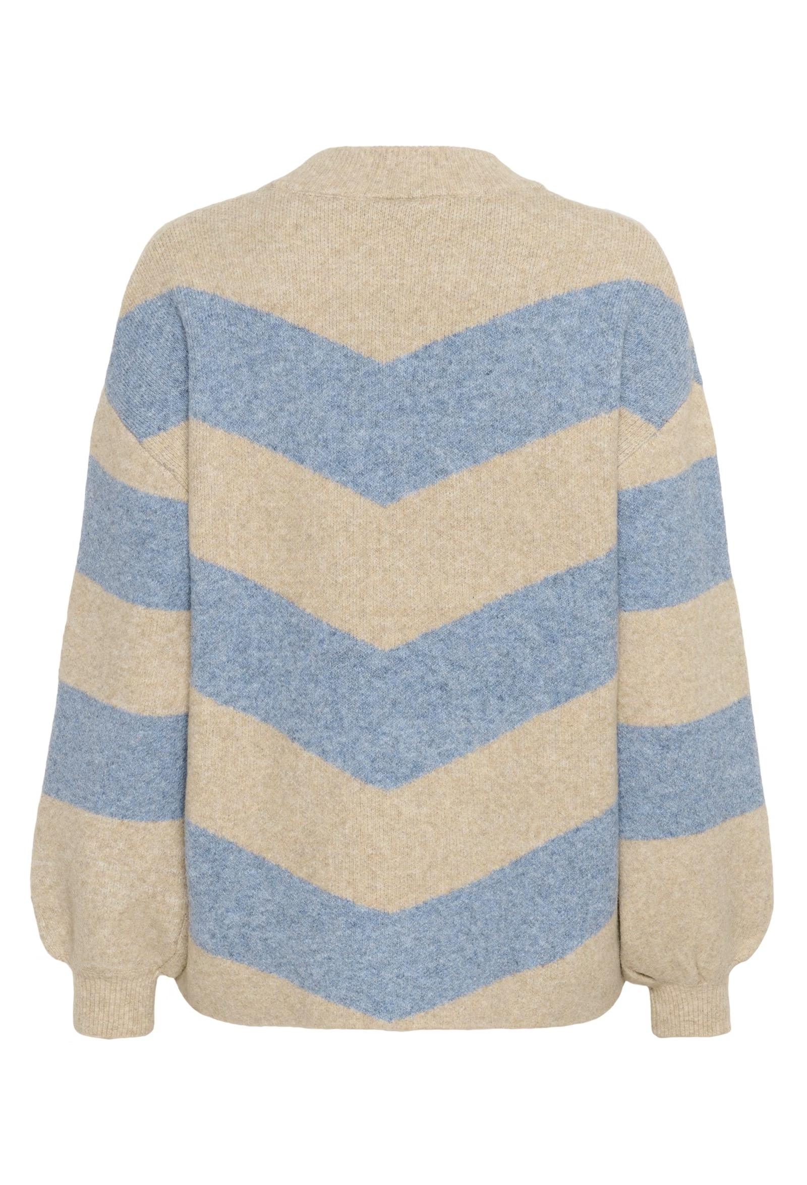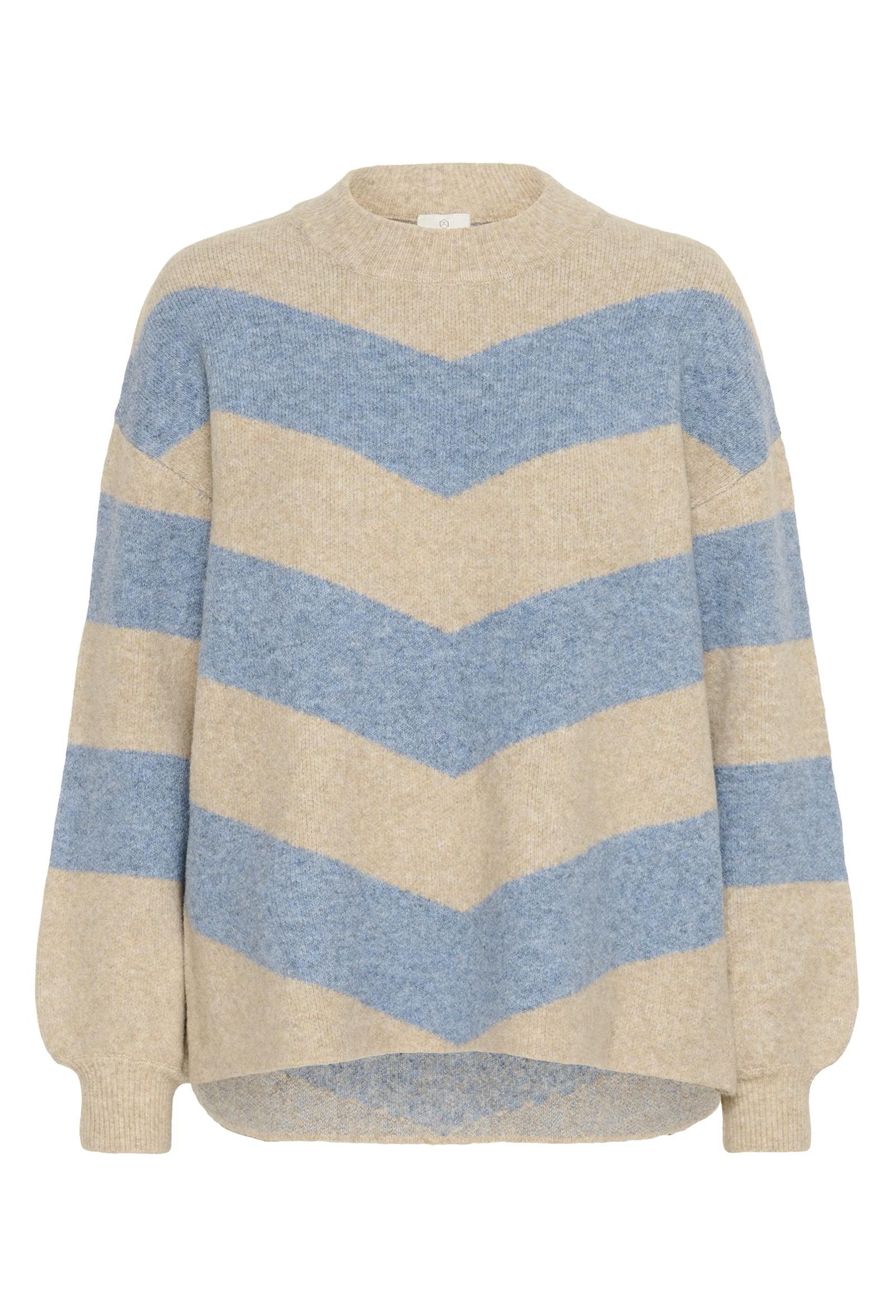 Striped sweater with a loose, comfortable silhouette, crew neckline, and long sleeves. Features dynamic diagonal and horizontal stripe design with a ribbed neckline and cuffs for a modern, textured look.