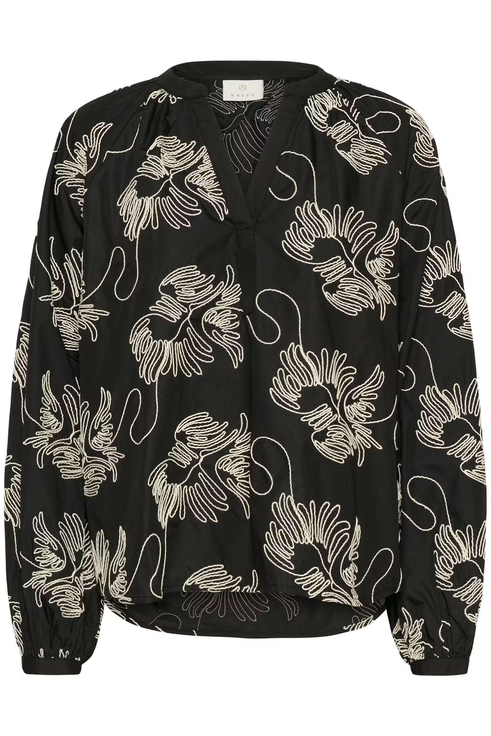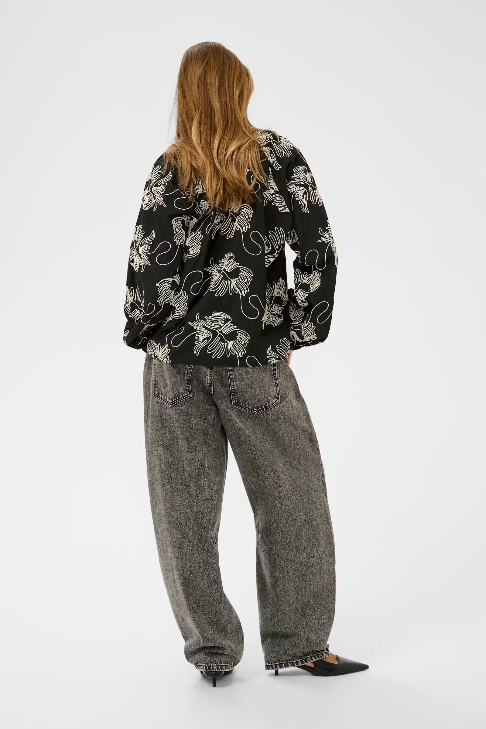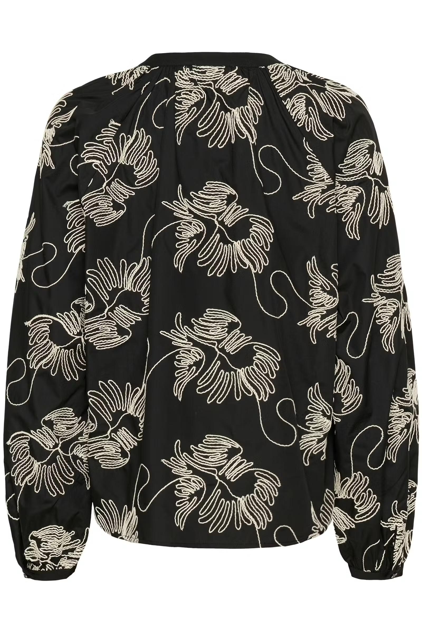 This embroidered blouse features a straight silhouette with a split V-neckline and long sleeves gathered at the cuffs. The blouse has visible textured embroidery throughout with a relaxed, slightly loose fit and a curved hem.
