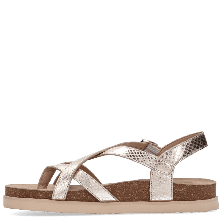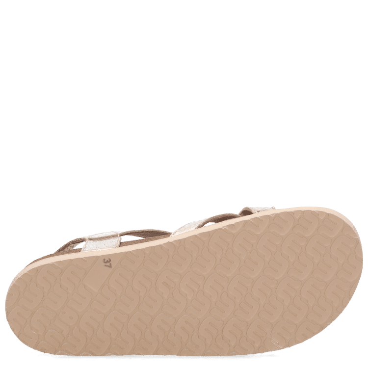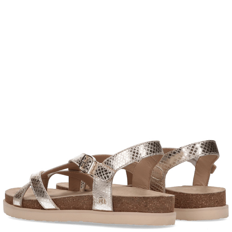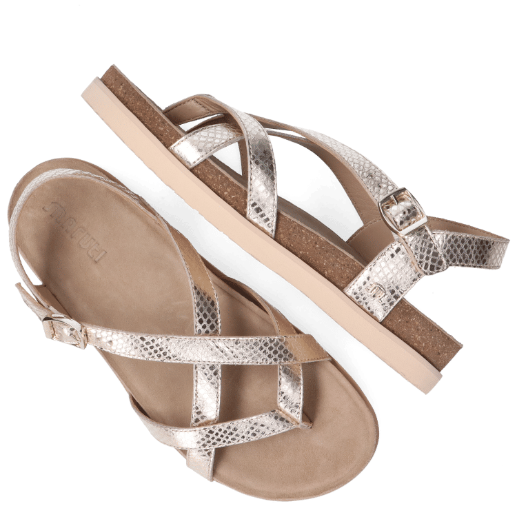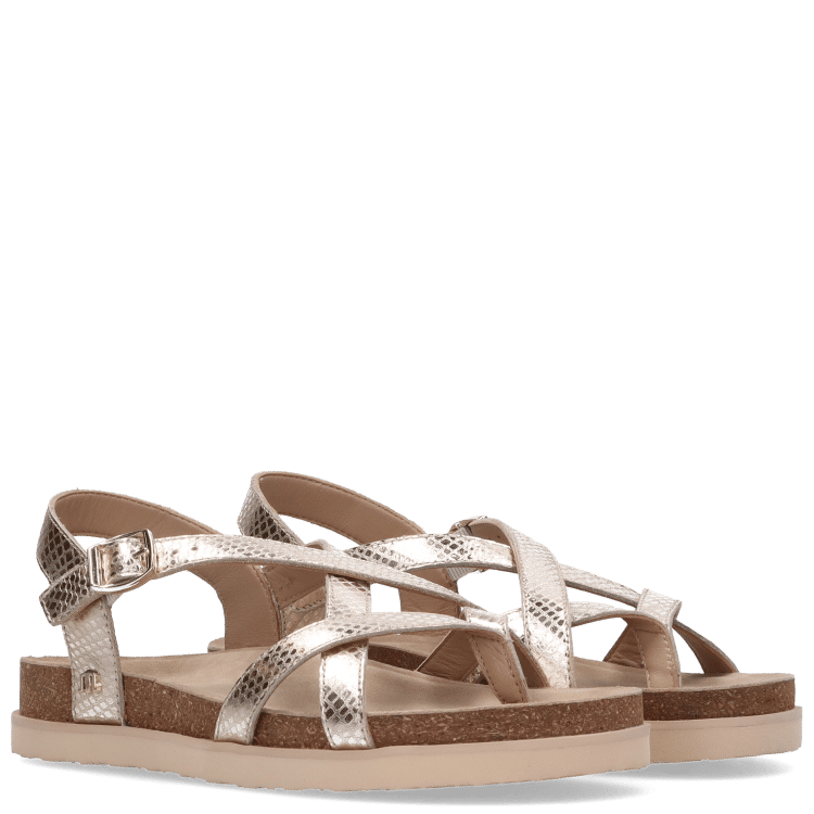 Crafted in a gold shade, the design features multiple cross-over straps that create a secure and supportive fit while adding subtle visual interest. The adjustable ankle strap with buckle fastening allows for a personalised fit, ensuring comfort throughout the day.