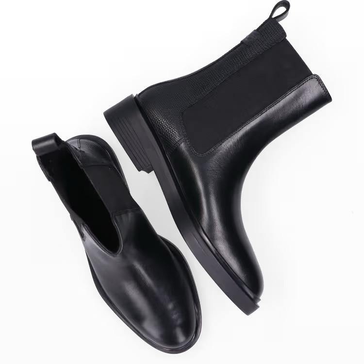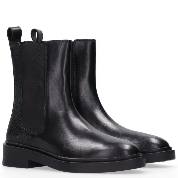 The Fallon Chelsea Boots Lizard by Maruti combine a sleek design with a playful touch. Made from black leather, these ankle boots feature a subtle lizard pattern at the back. The elastic sides make them easy to slip on and ensure a comfortable fit. With their flat sole, the Fallon boots are perfect for all-day wear. A versatile boot that brings together style and comfort.