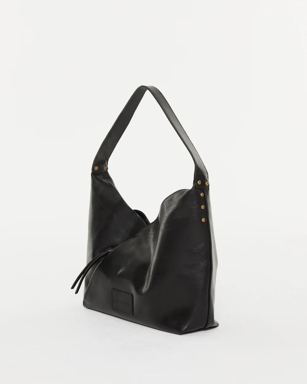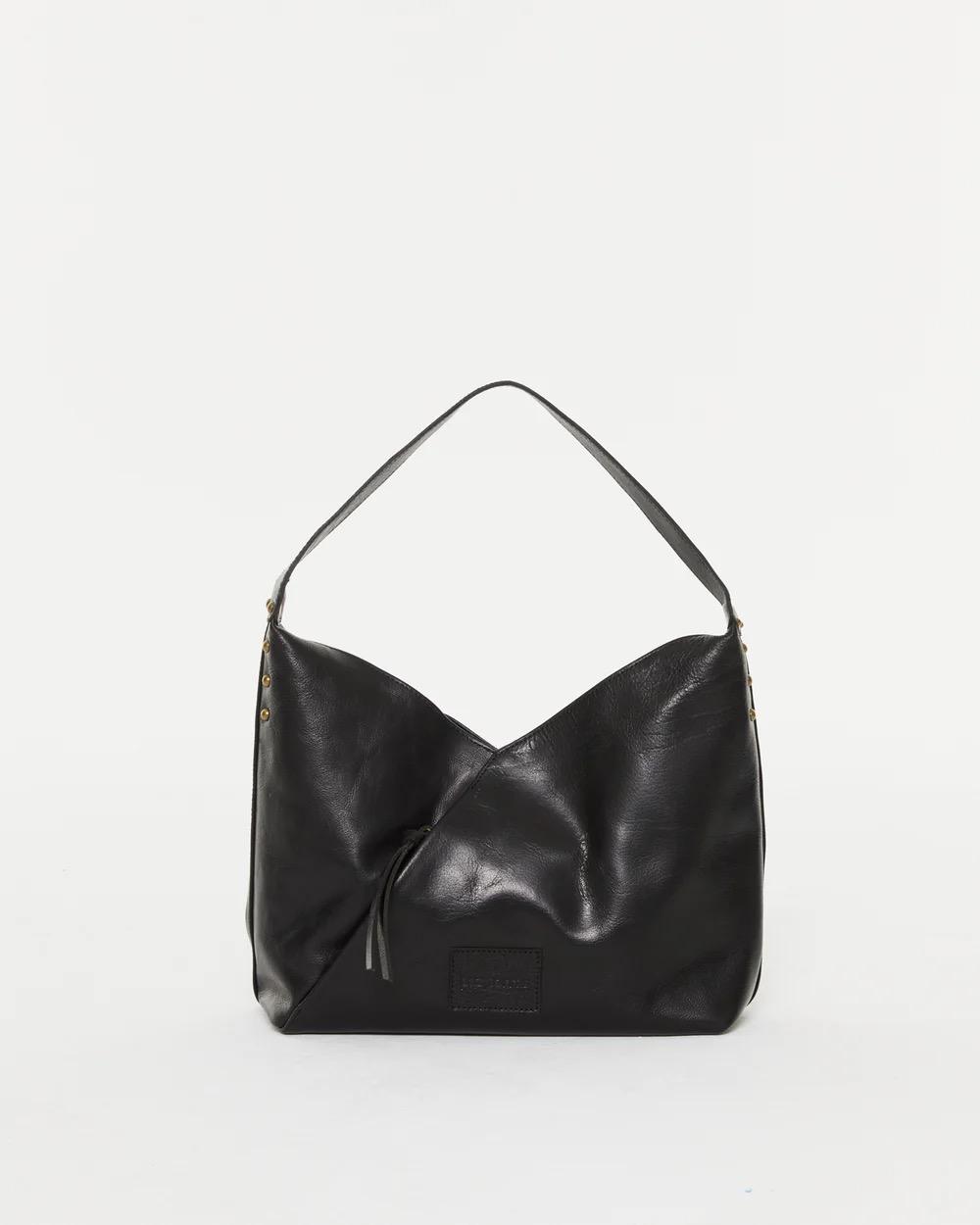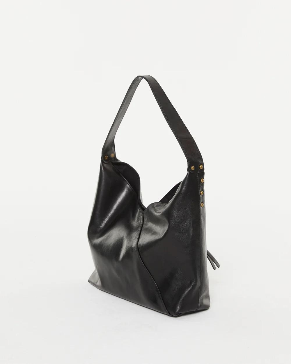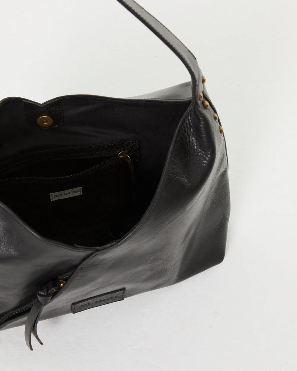 Large leather bag with a handle. It has two zippered pockets: one on the outside and a security pocket on the inside.