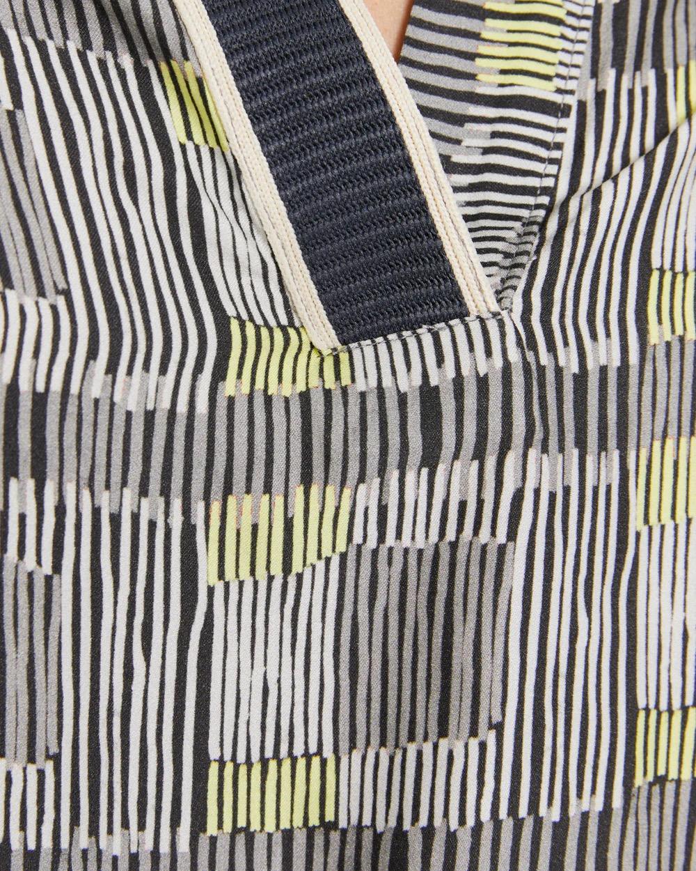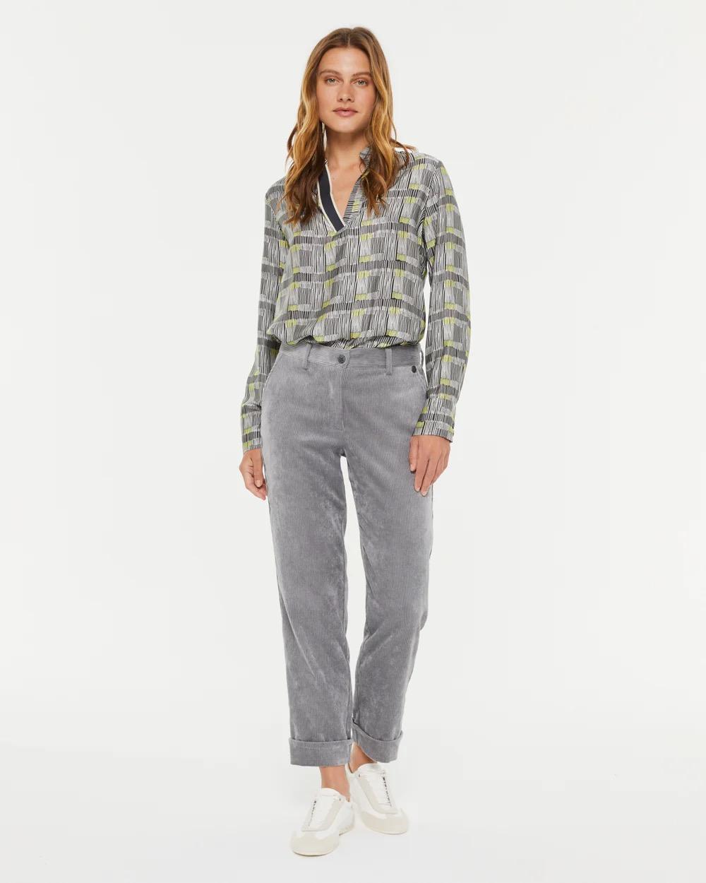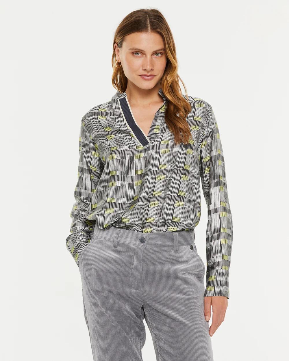 Checkered print blouse with long sleeves and a V-shaped mandarin collar and two-tone ribbon detailing at the neckline. One-button cuff closure. Regular fit.