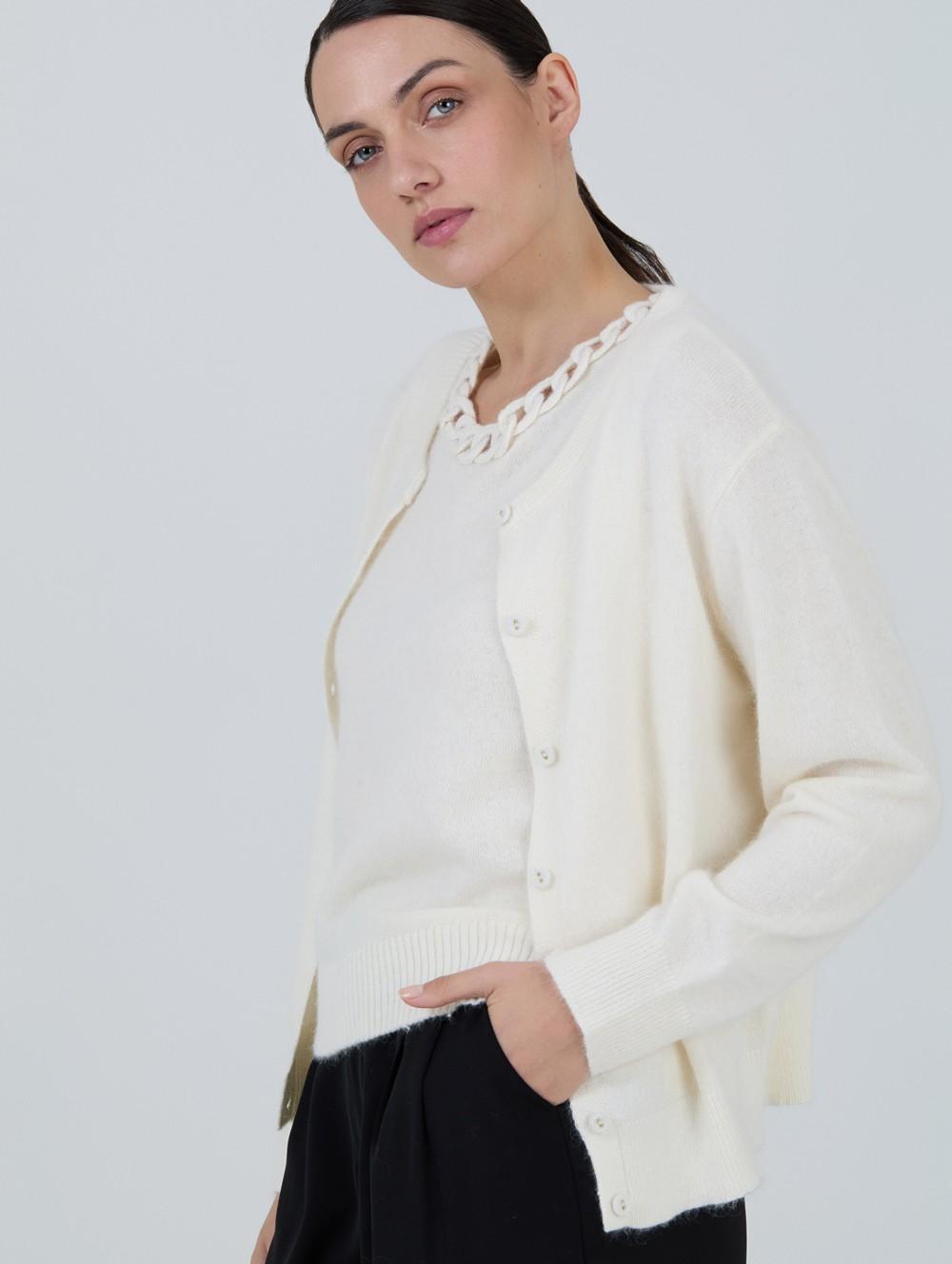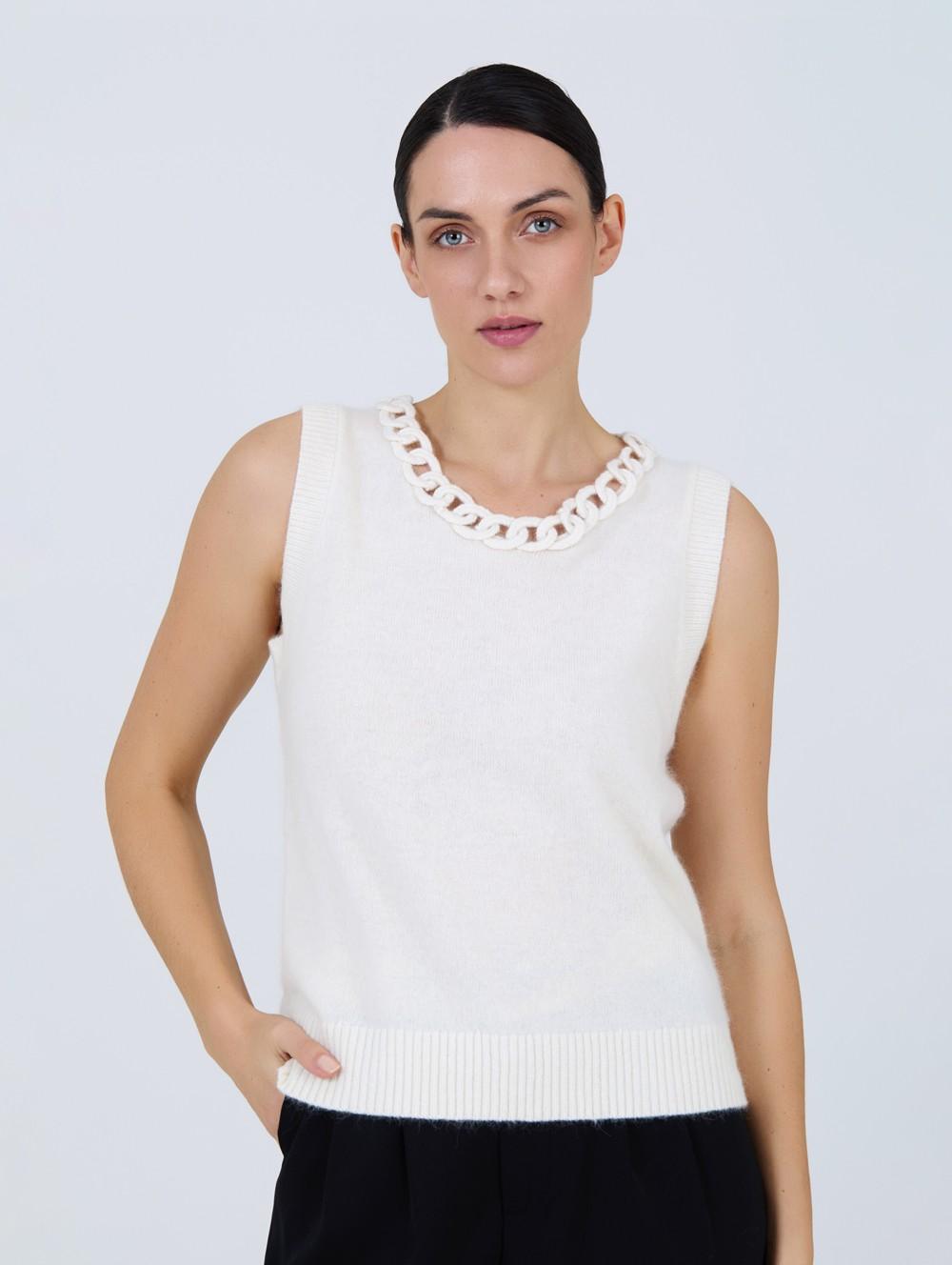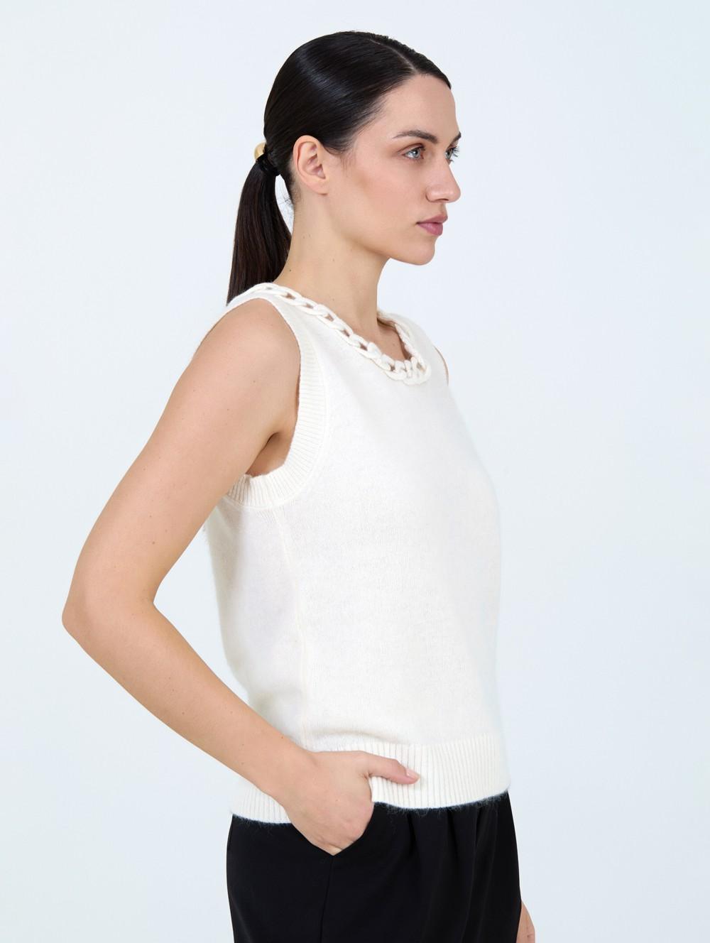Sleeveless knit top in angora and wool blend yarn. Features a lined chain at neckline. Round neck.