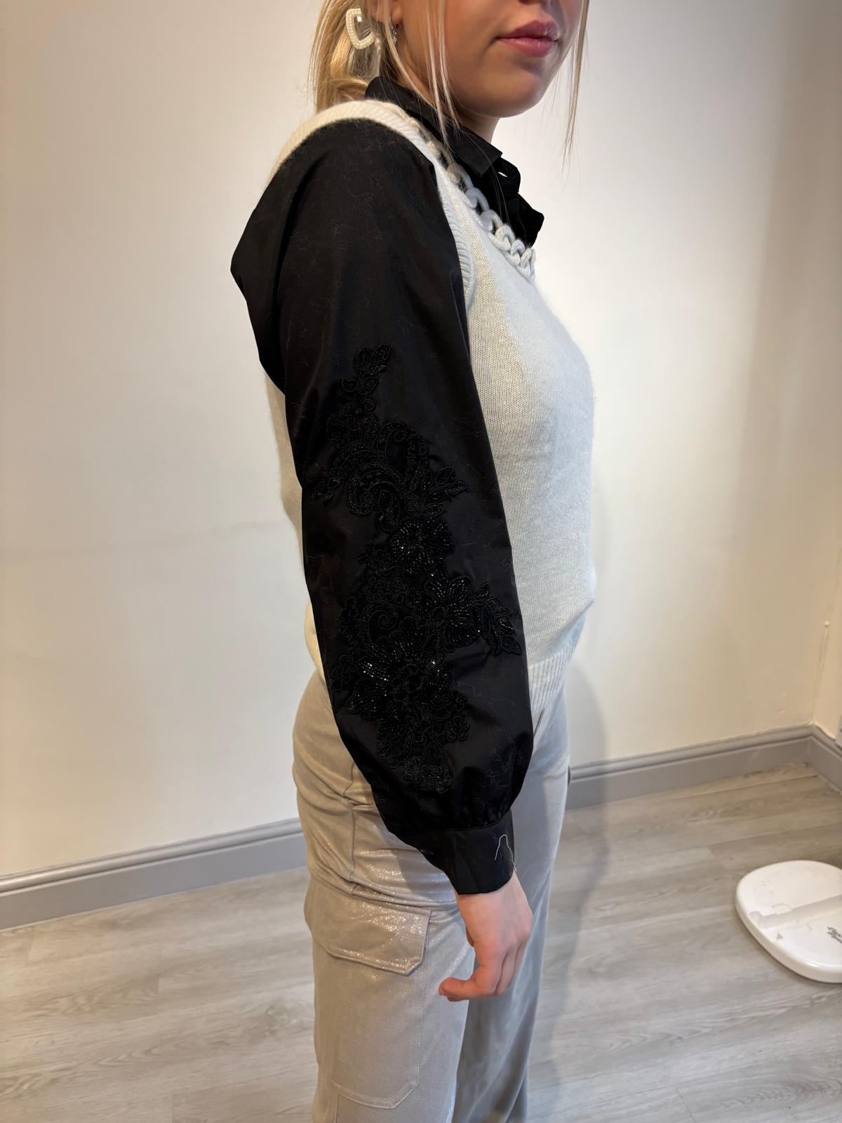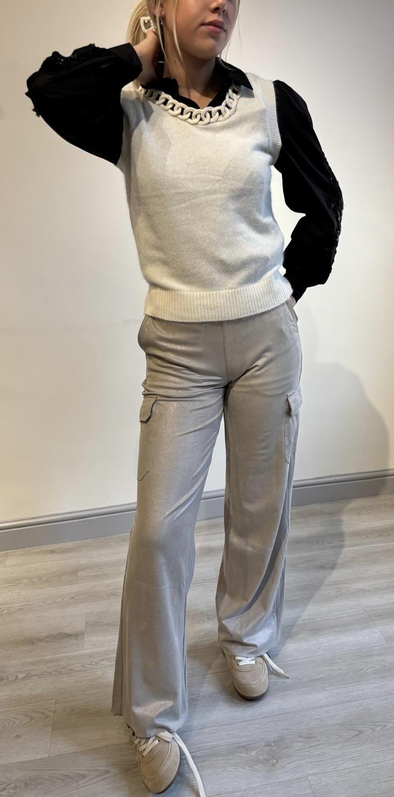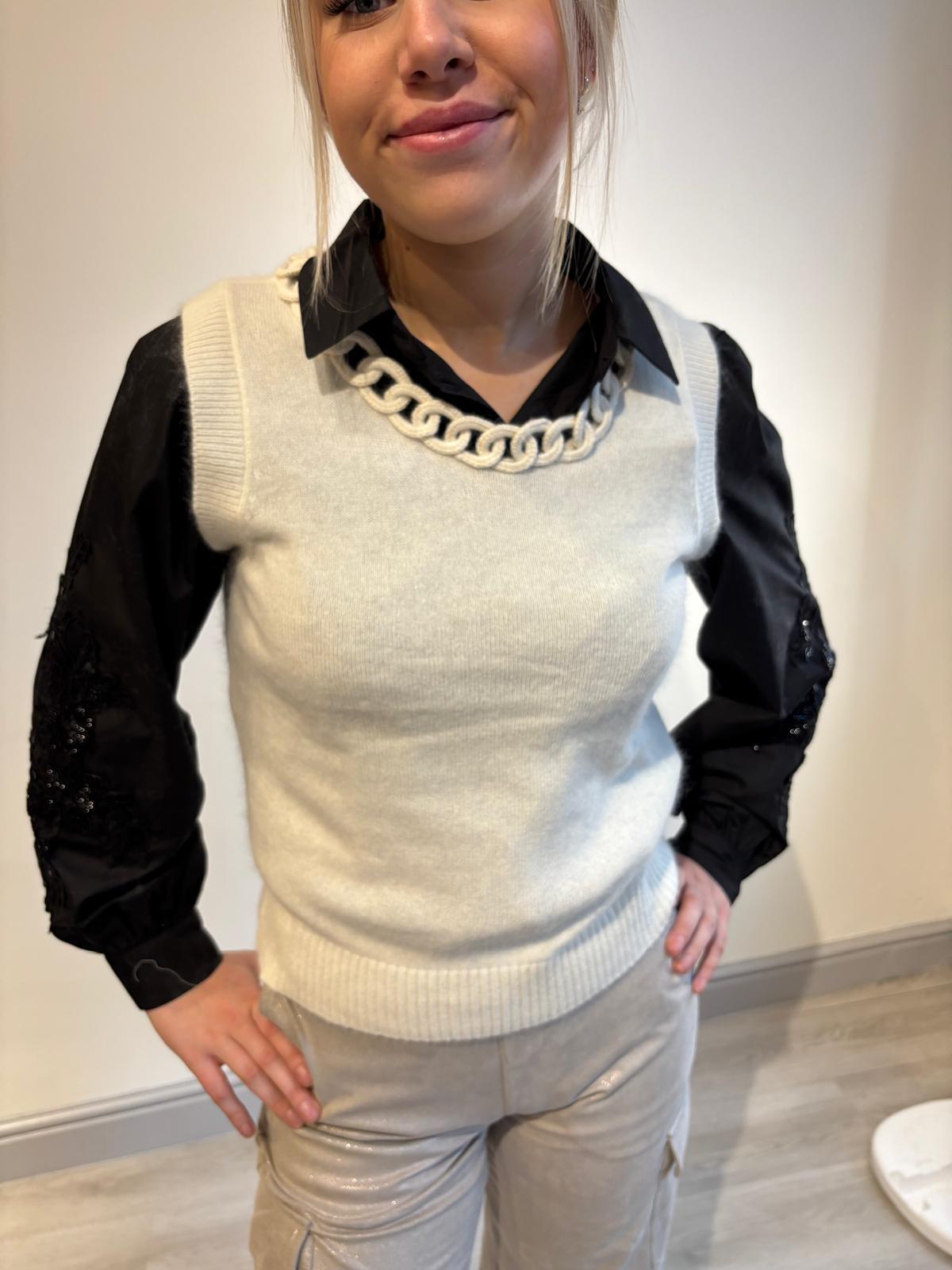 Sleeveless knit top in angora and wool blend yarn. Features a lined chain at neckline. Round neck.
