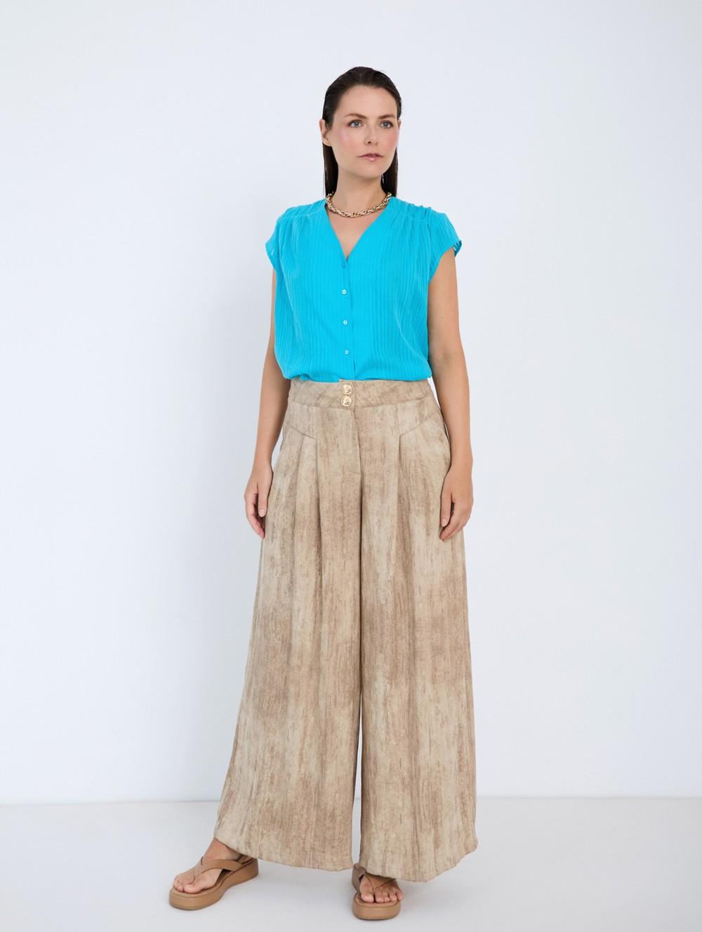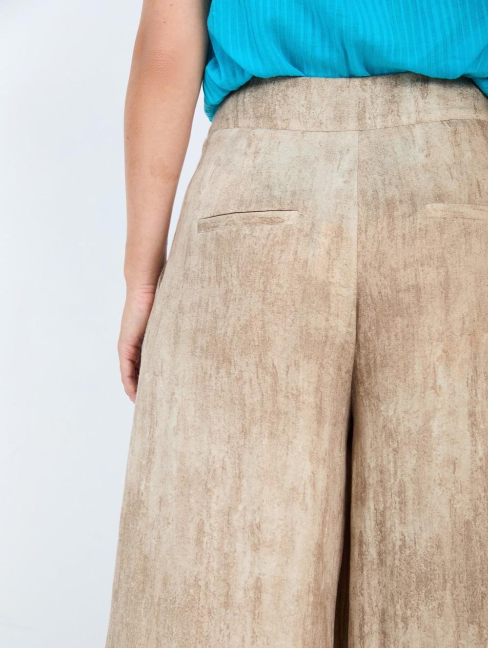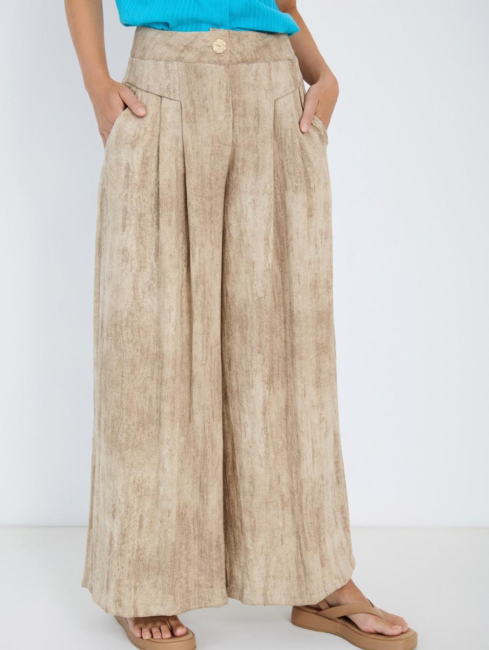 A front pleated panel introduces subtle volume while enhancing the fluid movement of the fabric. The wide-leg palazzo cut flows smoothly from the waist to the hem, creating an elongated silhouette that pairs effortlessly with both casual tops and more refined pieces.